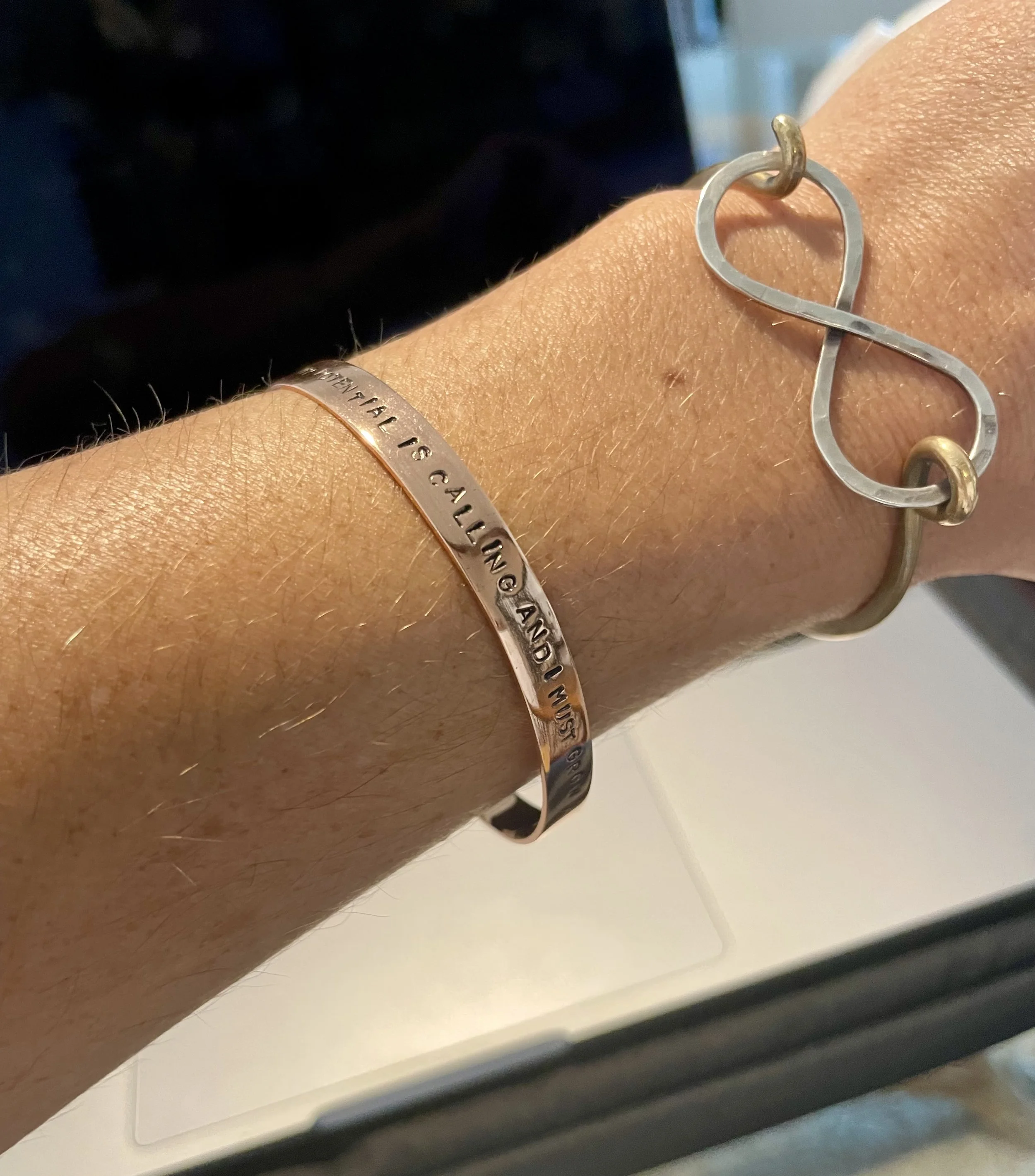 The bracelet is stamped with the text “MY POTENTIAL IS CALLING AND I MUST GROW,” and is filled with black enamel to help the message stand out.
